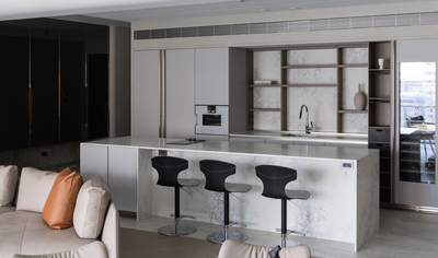 「回到家一腳踩下玄關地板,一種難以言喻的踏實感襲來,這是沒有體驗過的人無法想像的感覺。」Arthur 在風格獨具的家中,別出心裁地挑選帶有內斂紋理的 Black Jasper 黑色帝雉石作為地板材料,首先為雙腳提供了撫慰與歸屬感。