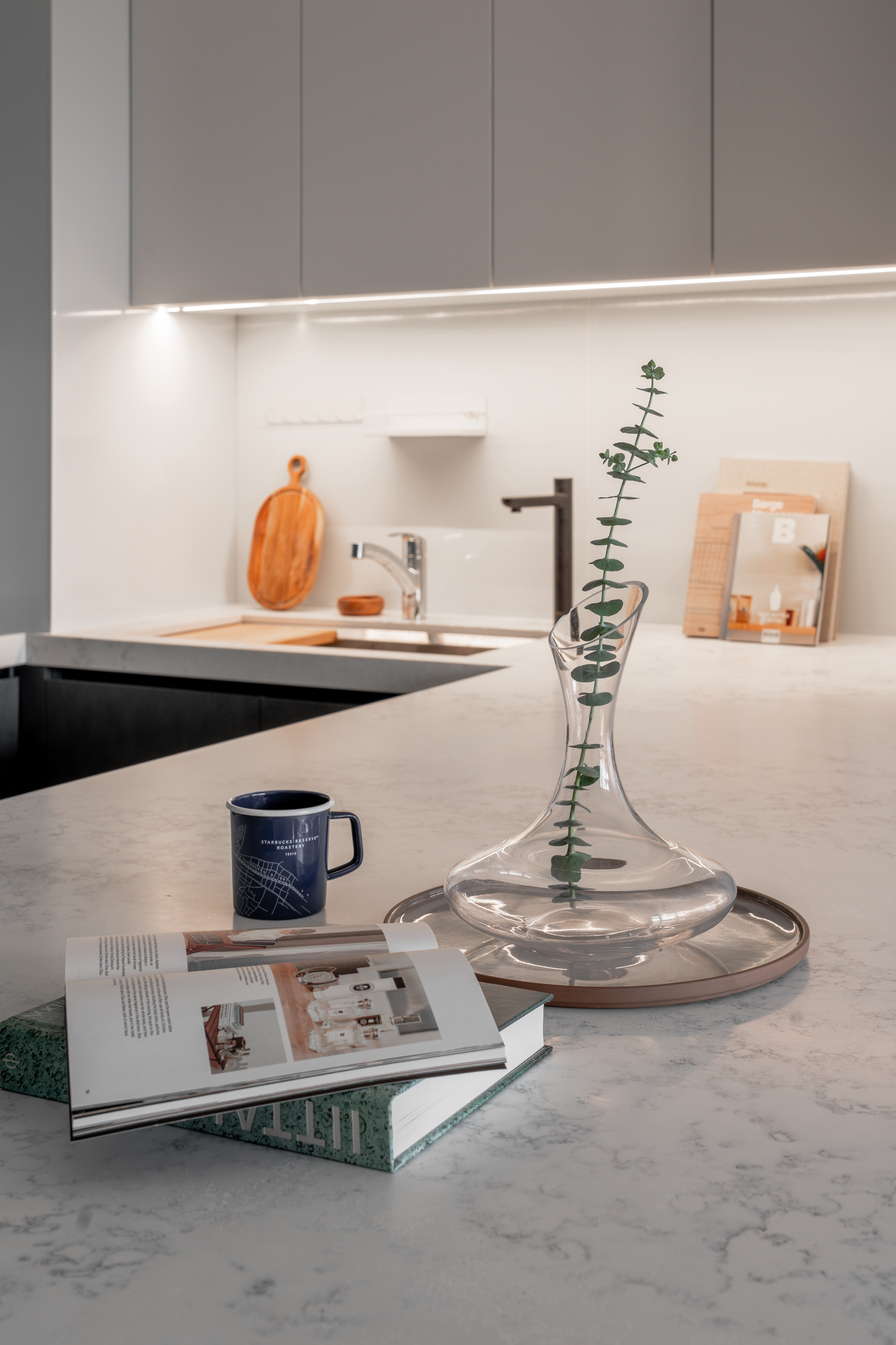 事實上,台灣製人造石英石結合了兩者優點,不僅抗污、抗菌且具高硬度,更展現出自然優雅的紋理。