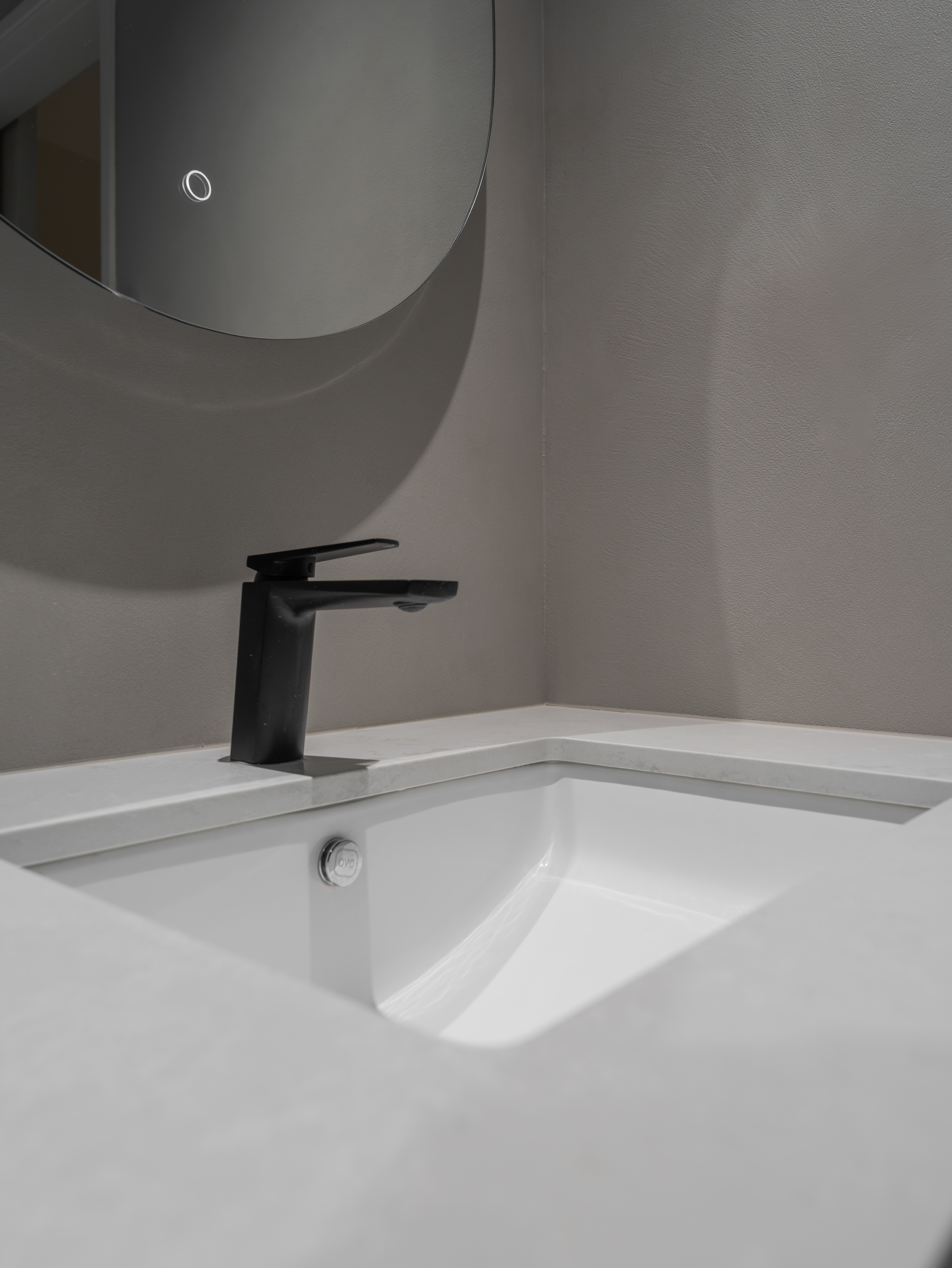 由於吸水率低、表面均質,石英石對水氣與蒸氣的耐受度高,不易因濕度變化產生白化或剝落。若你在評估「石英石適合浴室嗎」,可將其視為洗手台檯面、浴缸邊框與化妝台常見且可靠的材質。