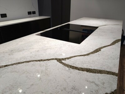 墨綠石紋蔓延灰白石面,似清泉流過百年樹根,浸泡釋出濃濃山林的氣息,苔蘚青翠,綠影婆娑,獨特紋理彷如森林的叨叨絮絮。