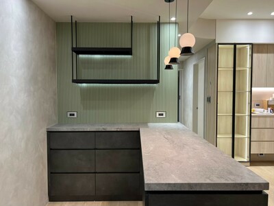 泥灰色石面仿水泥牆質地,顛覆都會叢林的現代感,顆粒隨性佈灑於粗糙表面,不加以修飾的原始肌理,碰撞出截然不同的視覺感受。